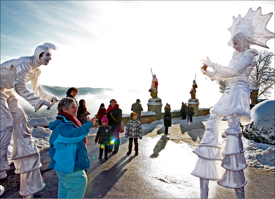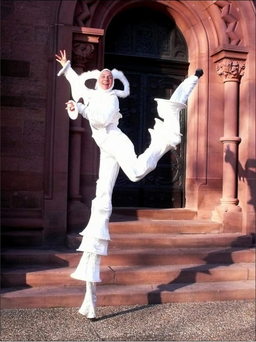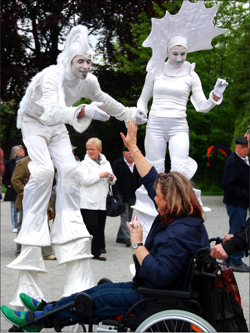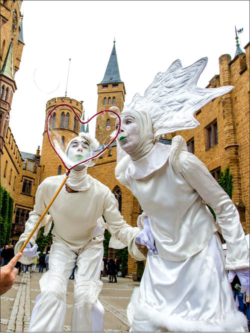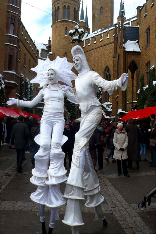 Auf Stelzen überraschen „Die Fuhls“ durch ihr Spiel mit den Zuschauern. Sie agieren ohne Sprache, dafür mit eindeutigen Gesten und Handlungen: Was oder wer da ist, wird unaufdringlich mit einbezogen und so wird ein Platz mit seinen Menschen zum Bühnenbild. Die beiden improvisieren miteinander und mit dem Publikum, ruhen sich zwischendurch mal auf einer Schulter aus, heben Kinder in die Luft und haben einen feinen Sinn dafür, den Moment zu nutzen.